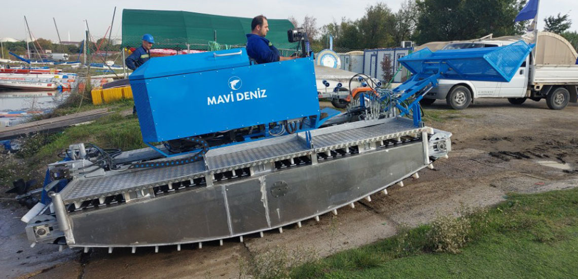 MAVİ DENİZ An amphibious machine can go both on water and on land. Amphibious machines can harvest and collect weeds and algae; dig, excavate, dredge, and desilt waterways with dredge pumps. The machine includes an oil skimmer tool to collect oil spills in shallow areas as well. Furthermore, it is equipped with a piling and hammering tool for poles and breaks rocks. The European Union Fund supported its export to Bulgaria.
